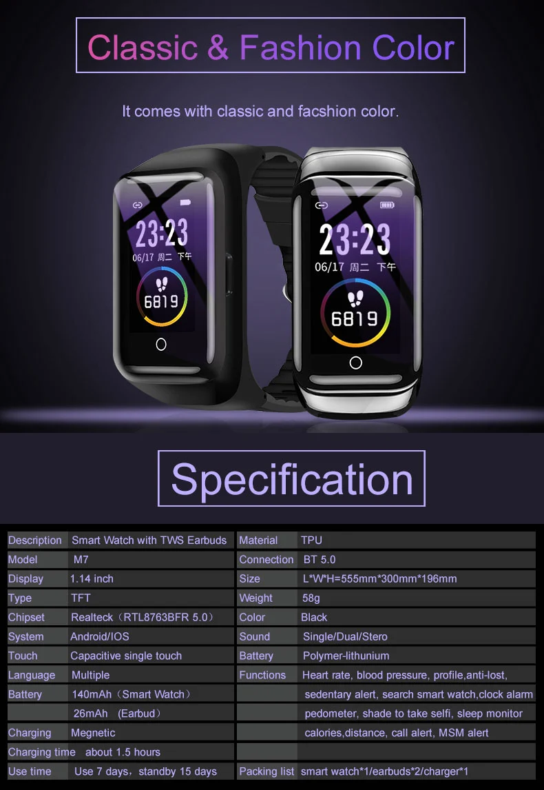 Function support; exercise heart rate, blood pressure reference value, personal information, alarm clock, exercise pedometer, photo, sleep monitoring. Intelligent anti-lost, sedentary reminder, search bracelet, calorie consumption, exercise mileage, call reminder, information reminder, MP3 music Play etc.